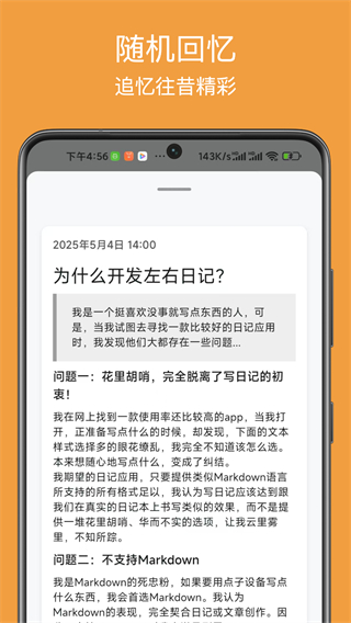 独有往年今日回忆功能,可随机调取过往同日期的日记内容,让用户能轻松回顾往日的生活精彩,重拾当时的心情与点滴记忆,极具情怀感。