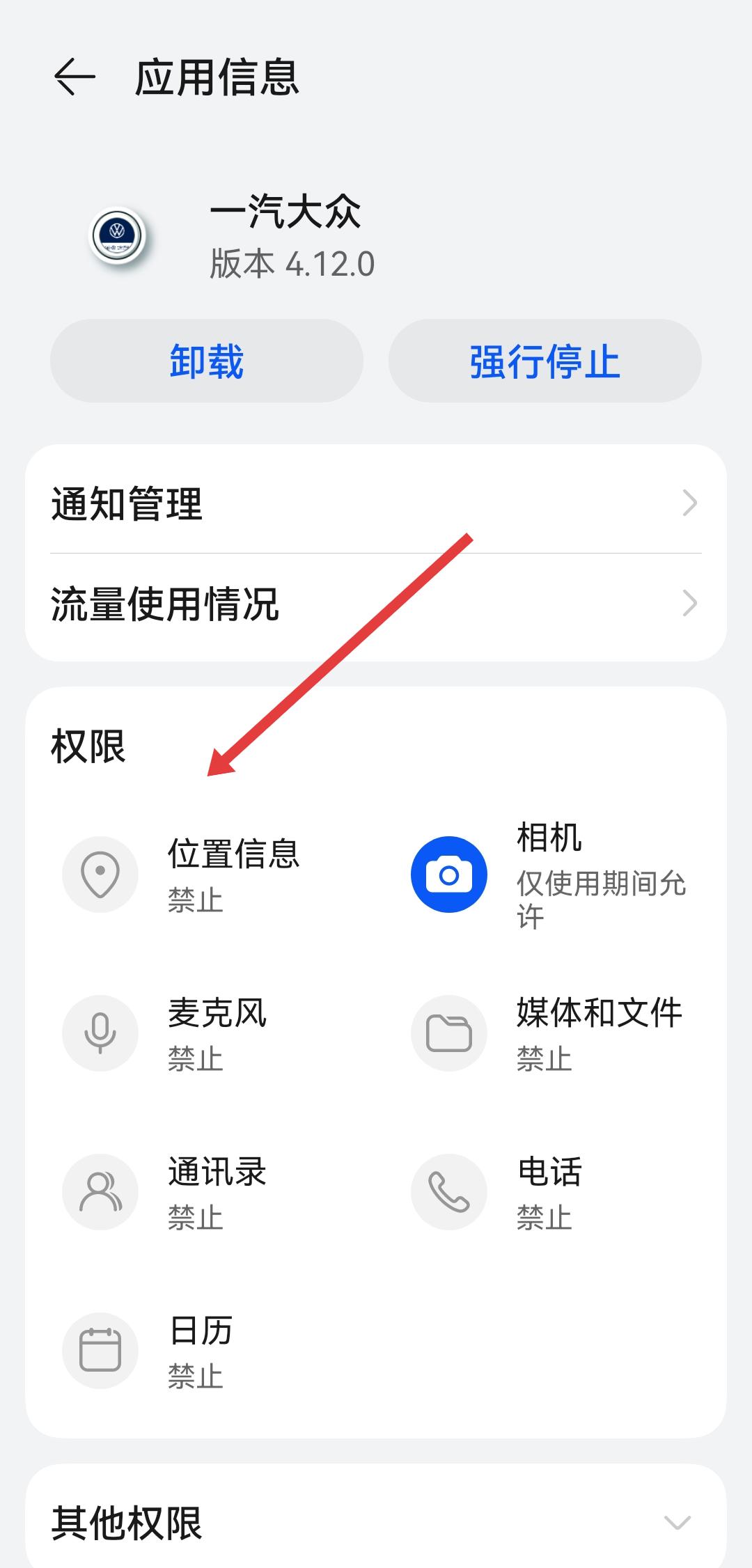 3、在应用信息页面的权限模块中,找到位置信息选项,点击将其设置为禁止,即可关闭一汽大众APP的定位权限。