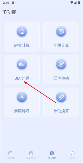 2、在多功能页面点击BMI计算选项,进入BMI指数计算页面。