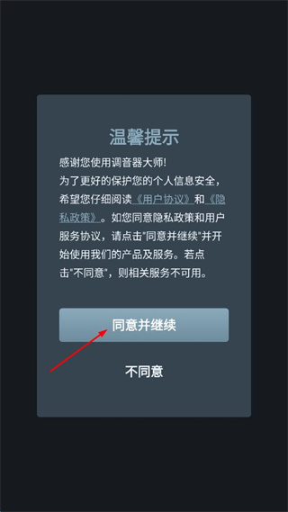1、打开调音器大师软件,查看弹出的温馨提示,点击同意并继续按钮进入主界面。