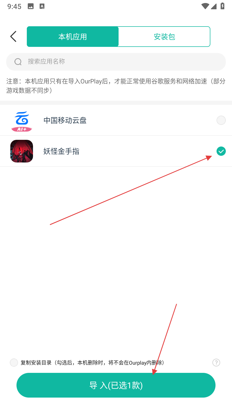 1、开启OurPlay应用进入主界面,点击界面左上角导入游戏按钮,跳转到本机应用列表界面,可查看手机已安装应用。
