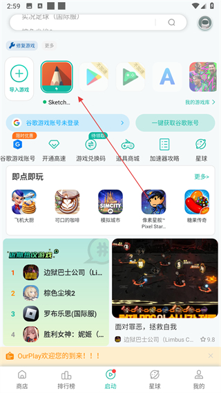 1、打开OurPlay软件,进入商店页面后,点击底部导航栏中的启动选项。