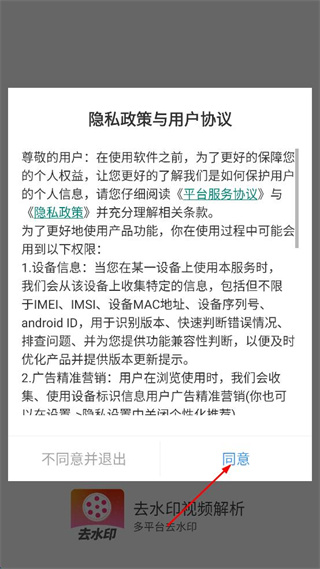 1、打开去水印视频解析软件,查看弹出的隐私政策与用户协议,点击同意按钮进入主界面。