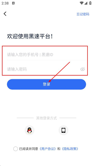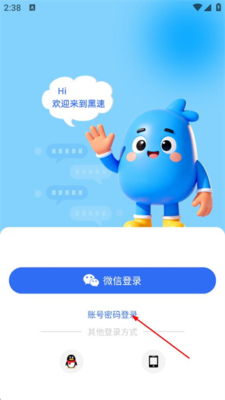 2、在黑速欢迎页面,点击账号密码登录选项,进入账号密码登录页面。