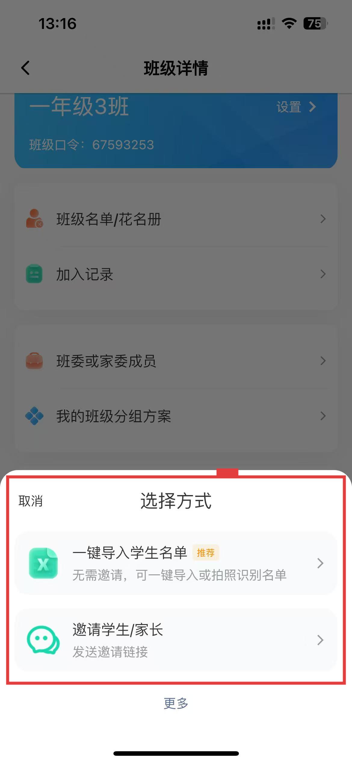 3、点击添加名单后,你可以选择一键导入学生名单,也可以选择通过发送邀请链接的方式让学生或家长加入班级。