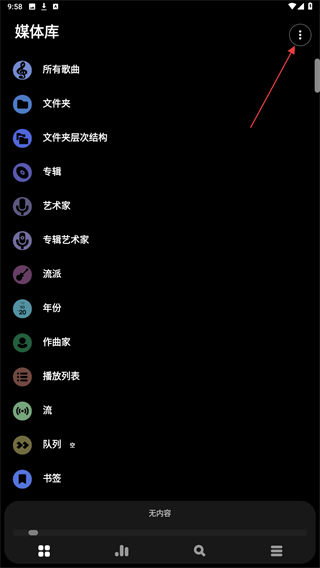 1、在Poweramp播放界面,点击左下方的功能图标,进入媒体库页面。