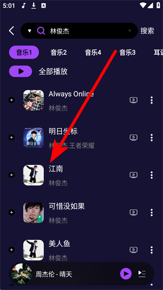 3、在搜索结果列表中找到目标歌曲,点击进入该歌曲的播放页面。