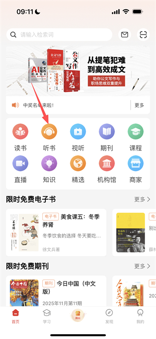 1、在易牍首页,点击听书选项,进入听书分类页面。