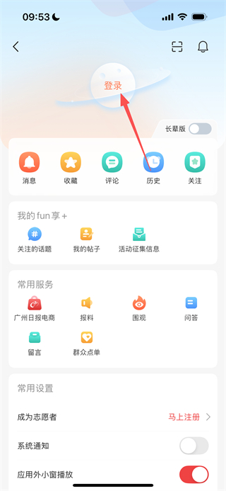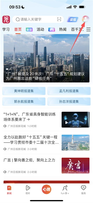 1、在广州日报新花城首页,点击右上角的个人头像,进入个人中心页面。