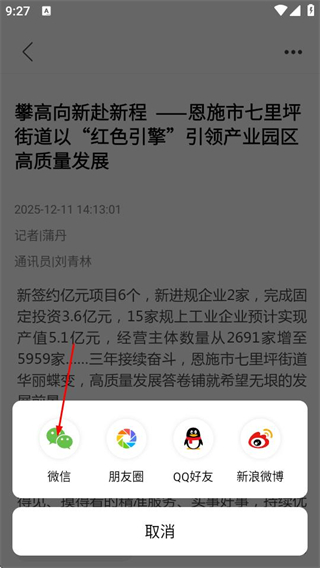 3、在分享窗口,选择微信渠道,即可将该文章分享到微信。