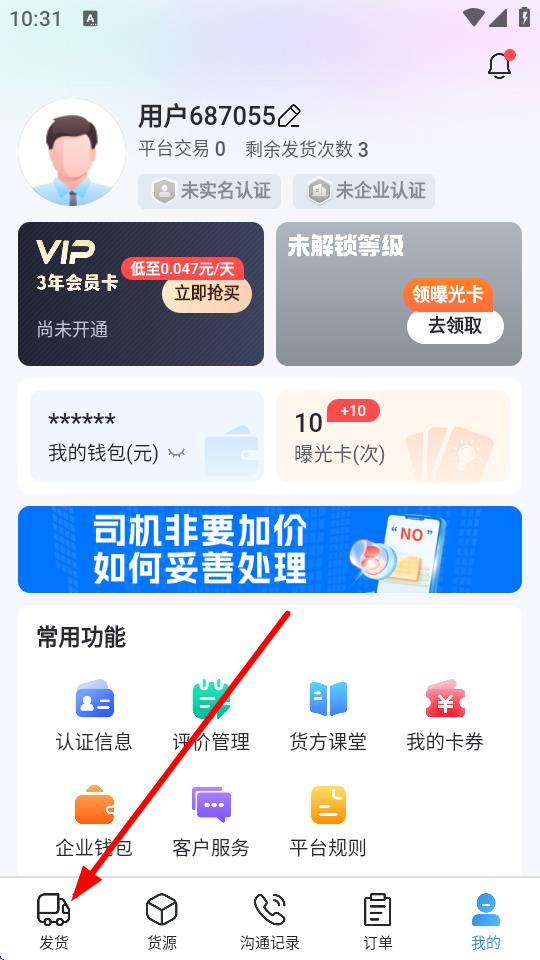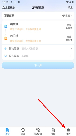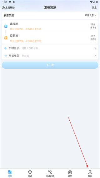 1、打开特运通APP,点击底部导航栏中的发货选项,进入发布货源页面。