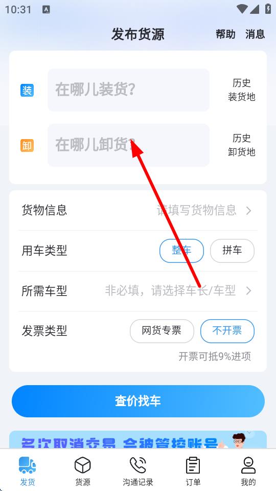 2、在发布货源页面,依次点击在哪儿装货和在哪儿卸货,输入或选择具体的装货地与卸货地。