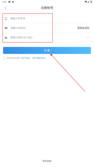 4、输入手机号、验证码以及密码后,点击注册的按钮即可。
