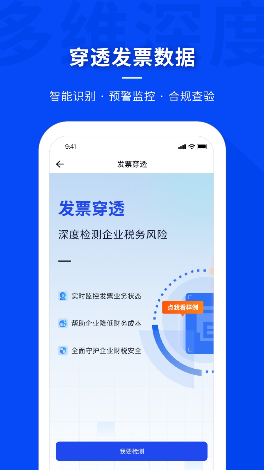 查税宝app是专门为企业监测税务风险的工具软件,我们软件具有强大的数据分析功能,只要你能提供正确有效的信息我们将会全面的为你分析运算,帮助你们企业的税务安全得到保障,我们还有全面的精准的税务风险掌控,赶快下载试一试吧。