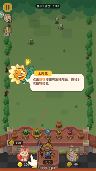 2、根据太阳花的提示,点击界面中的增强按钮,消耗阳光后可选择1次对应的植物技能,提升作战能力。