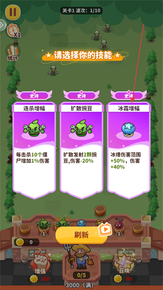 3、在请选择你的技能界面中,从连杀增幅、扩散豌豆、冰霜增幅等史诗技能里选一个,强化植物作战效果。