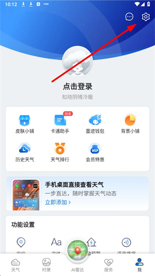 1、在墨迹天气应用我的页面,点击右上角的设置图标,进入设置功能界面。