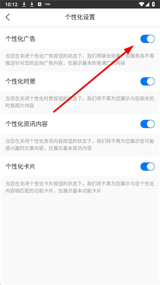 4、在个性化页面,找到个性化广告对应的开关,点击即可关闭。
