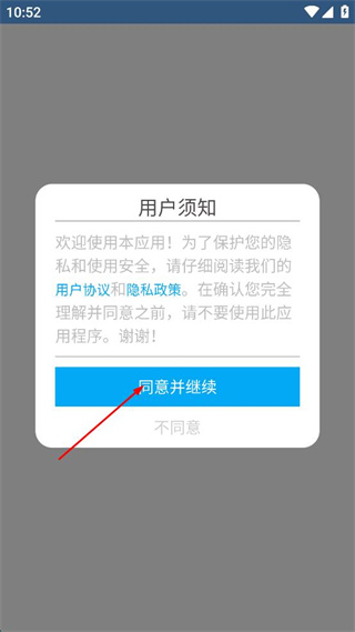 1、打开投屏软件后,在弹出的用户须知弹窗中,点击同意并继续按钮,进入主界面。