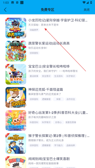 2、在喜马拉雅少儿页面中,找到免费专区按钮并点击,进入免费音频书籍列表页面。