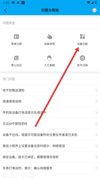 2、在跳转到问题与帮助页面后,可以点击设备功能进入查看相关问题。
