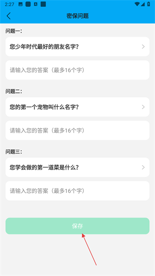 4、依次设置三个密保问题的答案,点击保存按钮即可。