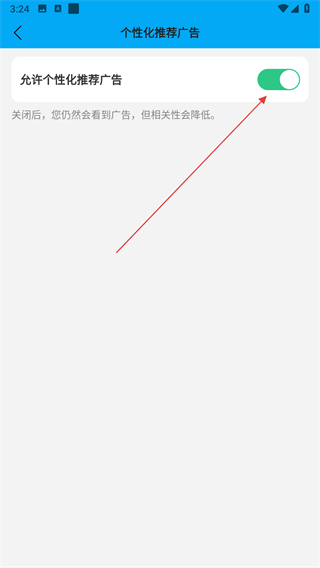 4、在个性化推荐广告页面中,点击允许个性化推荐广告对应的开关。