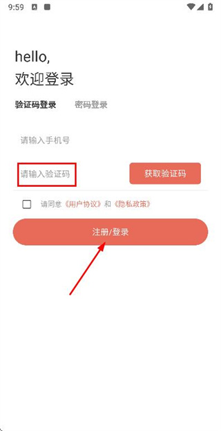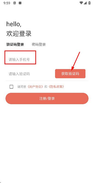 2、在登录页面填写手机号,勾选协议后,点击获取验证码。