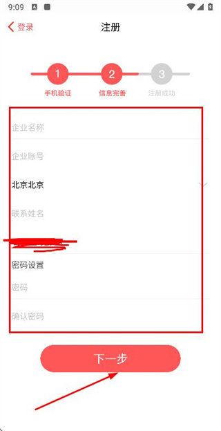 3、在注册的信息完善页面填写所需信息后,点击下一步进入注册成功页面。