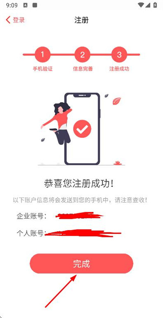 4、在注册成功页面点击完成按钮,结束整个注册流程。