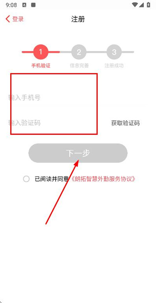 2、在注册的手机验证页面填写手机号与验证码,勾选协议后点击下一步,进入信息完善页面。