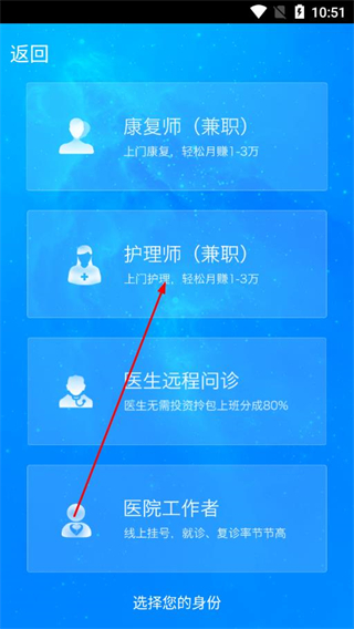 1、打开上门康复医护app的身份选择页面,选择对应医师身份,进入登录页面。