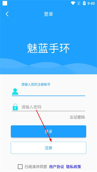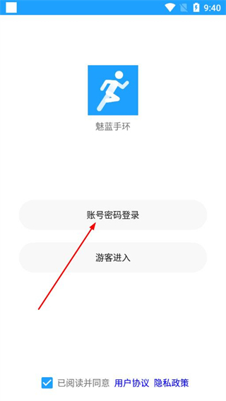 1、打开魅蓝手环app的初始页面,点击账号密码登录选项,进入登录页面。