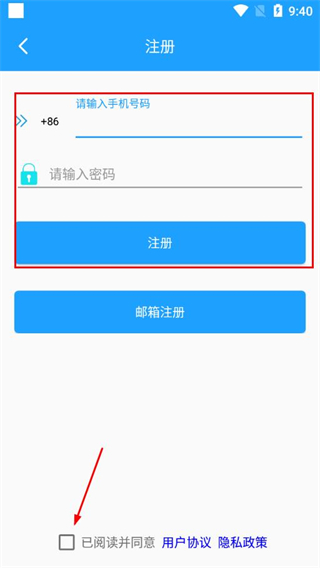 3、在注册页面填写手机号码、设置密码,勾选协议后,点击注册。