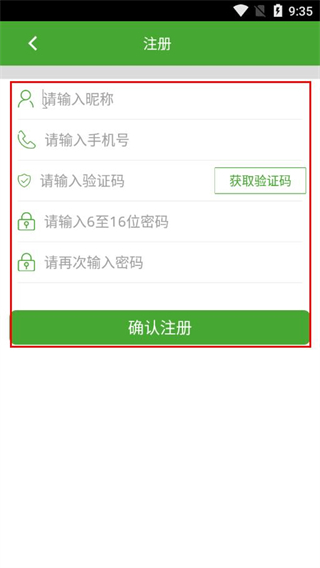3、填写昵称、手机号码和短信验证码,设置密码后再次确认密码,点击确认注册。
