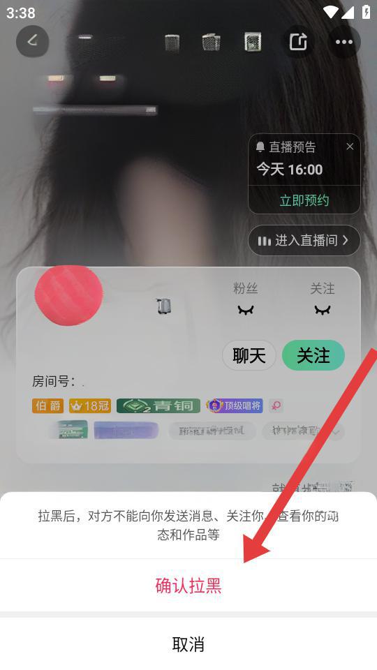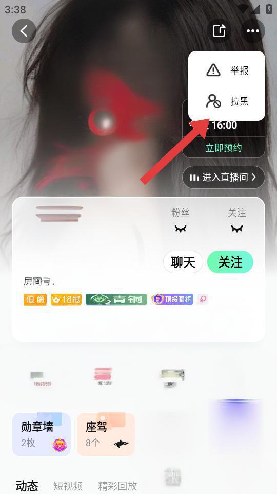 2、在主播个人的主页,点击右上角的三个点图标,在弹出的选项中选择拉黑。