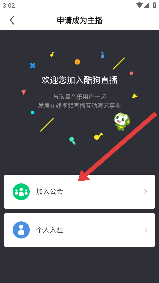 3、进入申请成为主播页面后,选择个人入驻,随后按照提示完成认证等操作,即可开通酷狗直播权限。