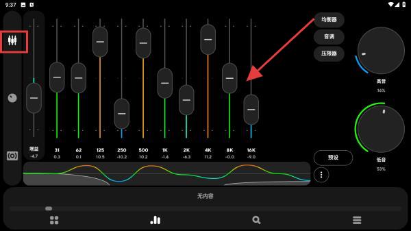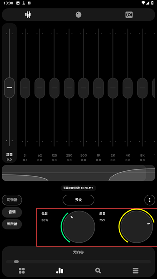 3、在均衡器界面下方,可通过低音、高音的圆形旋钮,快速调整整体强度比例。