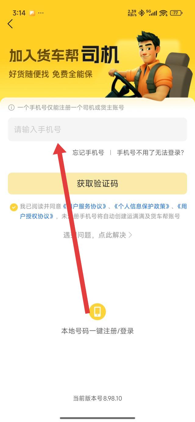 1、在货车帮司机注册界面,点击请输入手机号框,填写可用手机号,完成注册司机。
