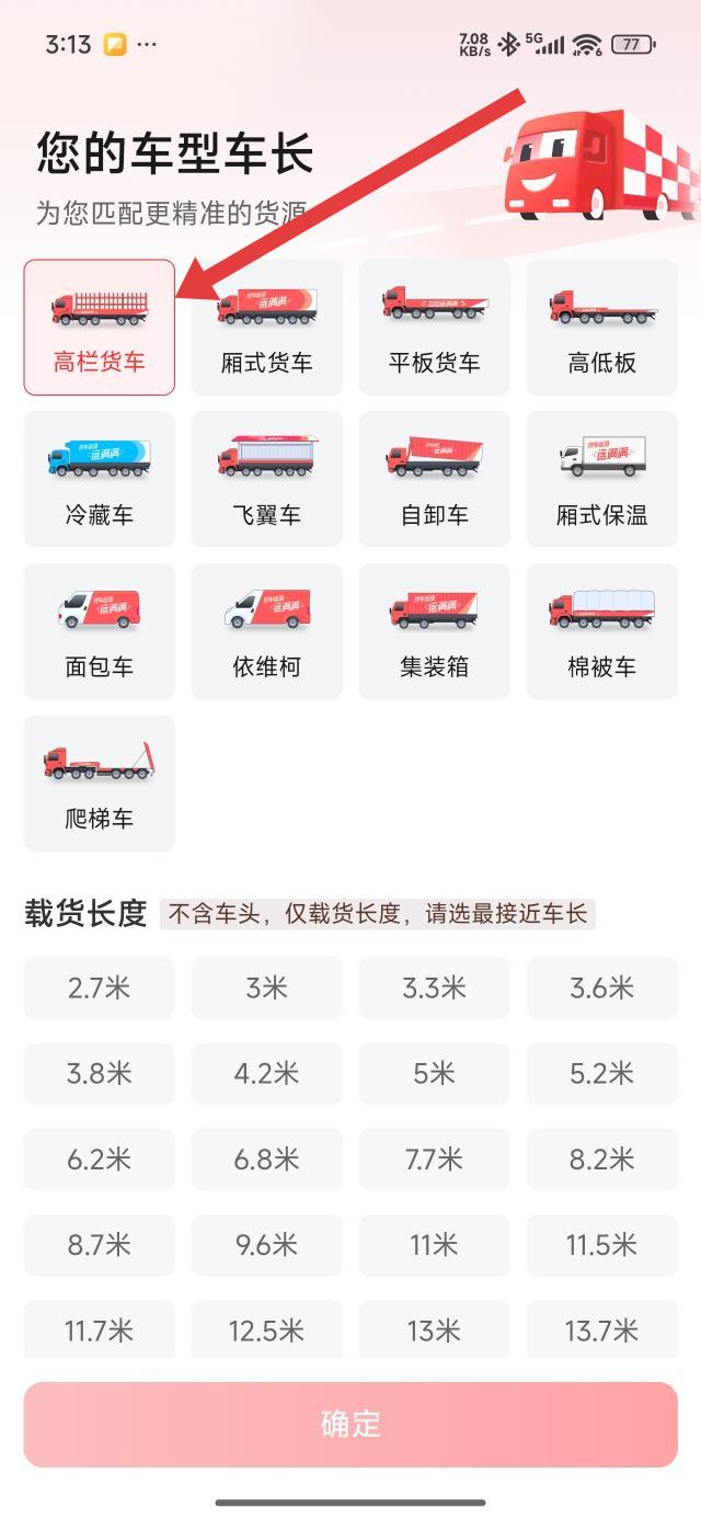 3、在车型车长选择页,可以选定高栏货车,再依据车辆载货长度,挑选最接近的尺寸,点击确定后成功加入。