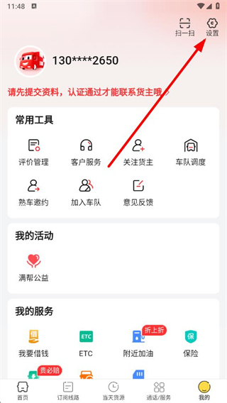 1、打开货车帮app,点击底部导航栏中的我的选项。