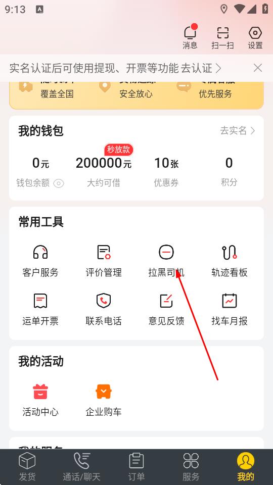 2、在我的页面,找到并点击常用工具板块中的拉黑司机选项。