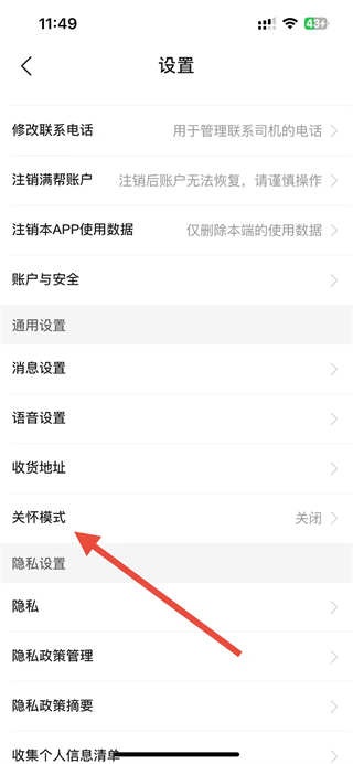 3、在设置页面点击关怀模式选项,进入关怀模式页面。