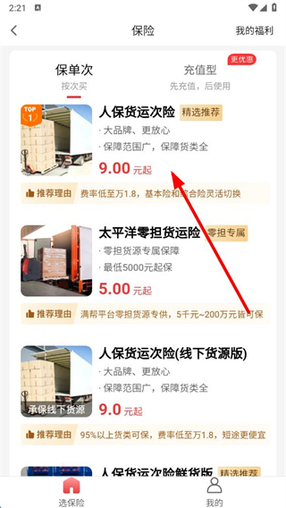 3、在保险页面,选择想要购买的保险产品,如人保货运次险。