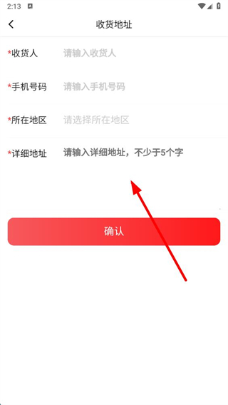 4、在收货地址页面,输入收货人、手机号码、所在地区和详细地址,点击确认按钮完成地址信息添加。