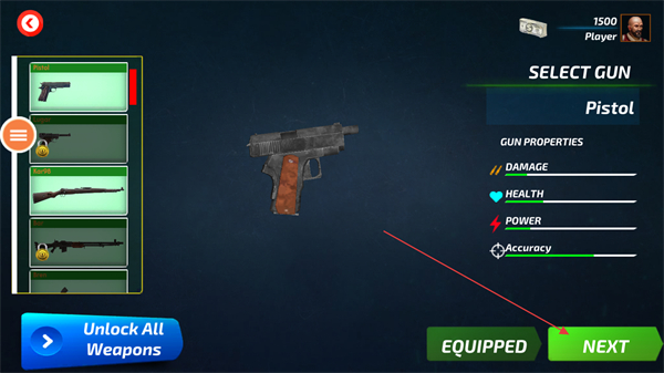 1、在武器选择界面,挑选手枪Pistol并点击NEXT进入战场。