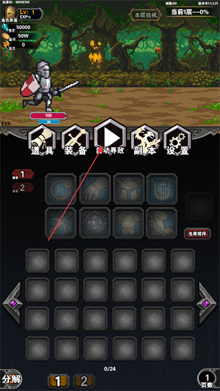 2、点击界面里的自动寻敌按钮,角色会自动寻找敌人战斗,同时可通过道具、装备功能管理资源与装备。