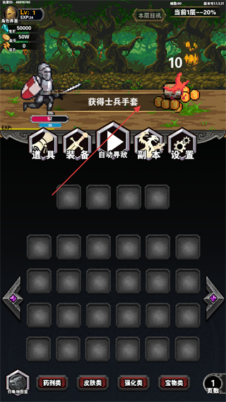 3、开启自动寻敌后,角色击败敌人可获取奖励,比如图中显示的获得士兵手套,以此积累装备提升角色。