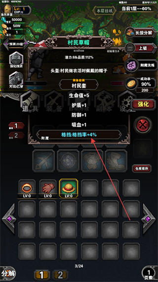 4、获取村民草帽后,可查看其属性加成,该装备属于村民套,能为角色增加生命值、防御等多项能力。