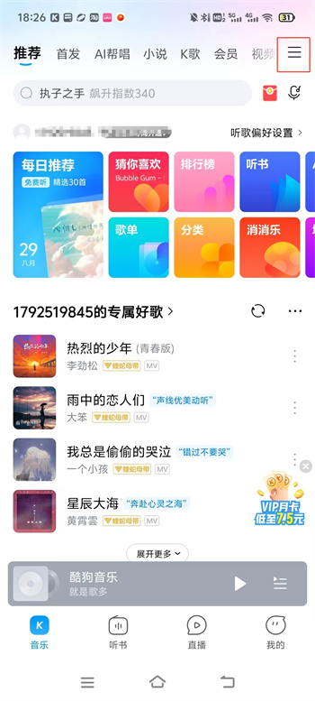 1、启动酷狗音乐APP,进入首页点击右上角三个横线的图标。